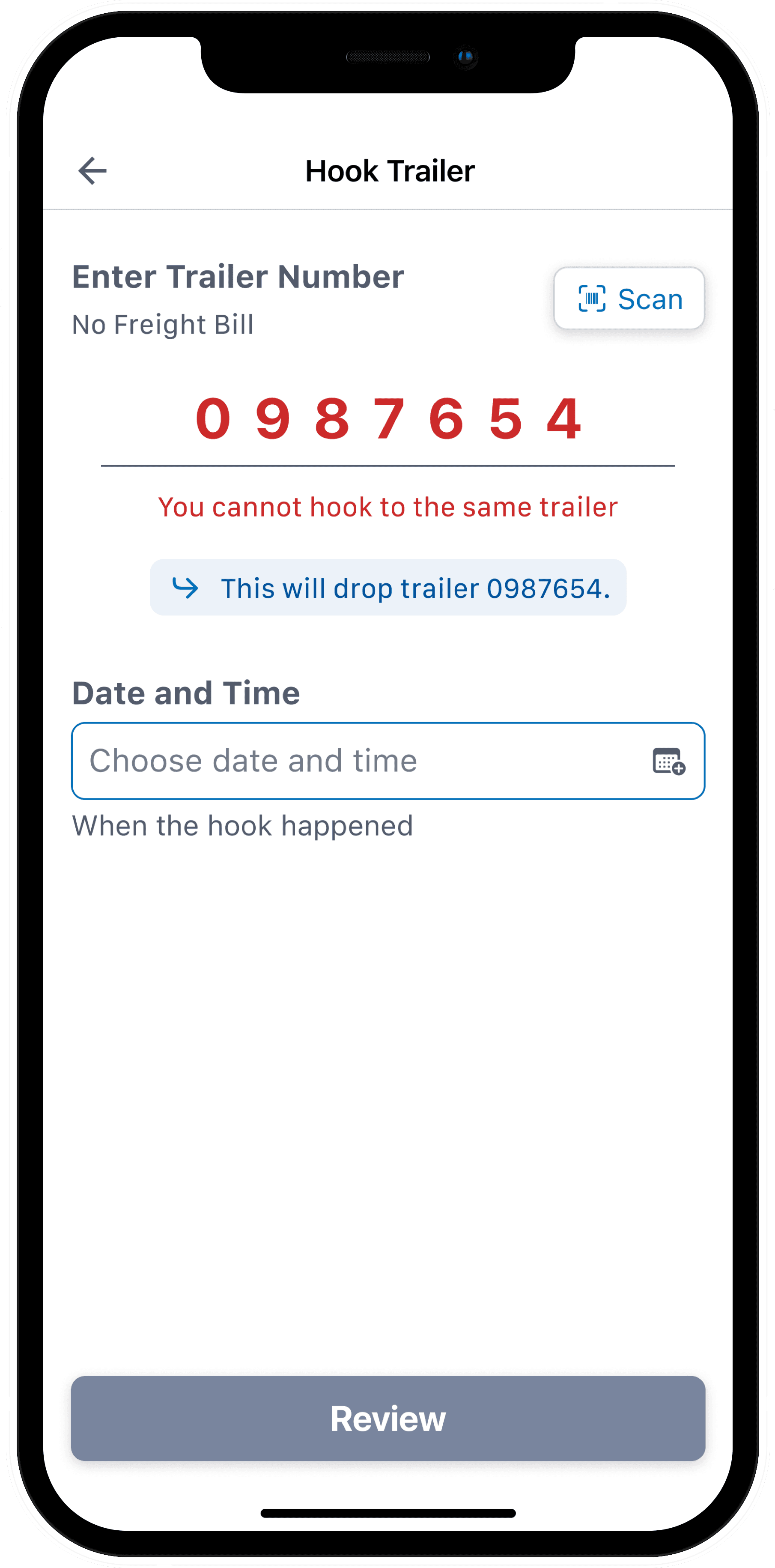 During testing, I uncovered a redundancy in the flow: requiring users to manually unhook before hooking a new trailer. By automating the drop of the previous trailer when a new one is hooked, we simplified the process and reduced the chance of human error.